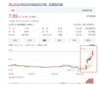 就在刚刚过去的7个交易日,常山药业连续斩获多个20CM涨停,股价涨幅累计超过70%,在A股一众“GLP-1”概念股“声名鹊起”。9月19日,常山药业延续火爆形势,开盘快速走高,并在盘中一度触及涨停;最终收盘价格锁定在7.89元,大涨13.69%。