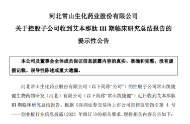 市场观点分析认为,GLP-1靶点已成为当下最热研发赛道之一,“降糖+减肥”适应症广阔的蓝海市场需求刺激了技术创新,尽管常山药业发布公告称尚未开展艾本那肽针对肥胖或减重的临床试验,其先进的技术平台和发展前景也吸引了广泛关注。