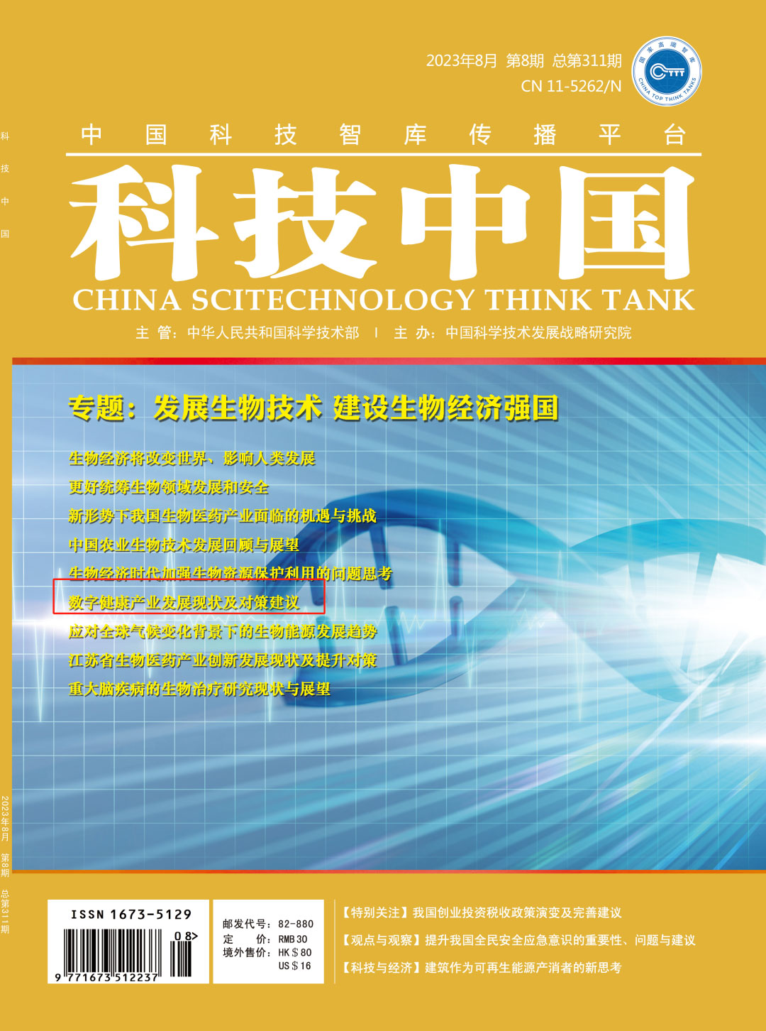 《科技中国》杂志由国家科技部主管、中国科学技术发展战略研究院主办、科技中国杂志社出版,面向海内外公开发行,被中国知网、万方数据、超星、维普网、中邮阅读网、中国人文社会科学A刊引文数据库全文收录。作为国家高端智库所属核心媒体,《科技中国》杂志重点关注国内外科技创新战略、创新驱动发展战略、科技政策和科技管理问题,以发表政策研究和咨询报告为主,主要观点经常被各级科技决策者采用,适合科技决策层、管理层、科研人员、企业家阅读参考。