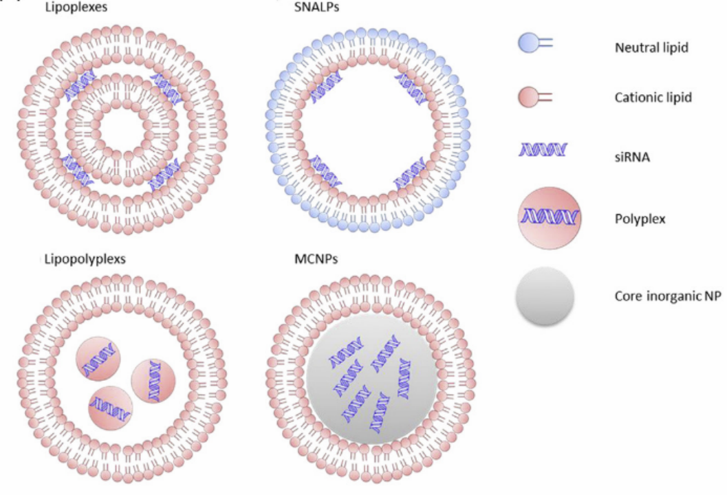 包封在脂质体中的siRNA在血液中通常比裸siRNA更稳定,这增强了siRNA的安全性、良好的耐受性和药代动力学。脂质体的表面可以与PEG试剂和各种靶向配体进一步结合。并且脂质体的组成可以通过插入后的方法用其他脂质修饰。脂质体的这些功能化,都是为了解决目前基因传递的关键挑战,如长血液循环、靶组织中的特异性细胞内摄取和高效的内体逃逸等。核酸药物递送存在四种类型的脂质体结构,包括脂复合物、稳定核酸脂质颗粒 (SNALP)、脂多复合体和膜核纳米颗粒(MCNP)。SNALPs被认为是临床应用中核酸药物,尤其是siRNA药物的有前途的全身递送。