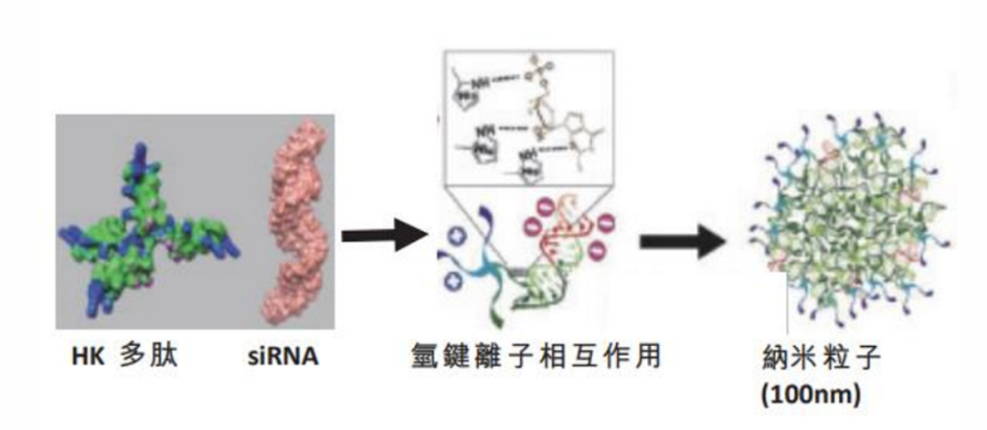 由组氨酸/赖氨酸聚合物(HKP)组成,可聚集为纳米颗粒,封装并保护10k~100k siRNA通过NRP1受体递送至靶组织和细胞;进入细胞后,通过组氨酸介导的质子化提升内涵体逃逸效率,将siRNA有效载荷释放到细胞质中的作用位点。