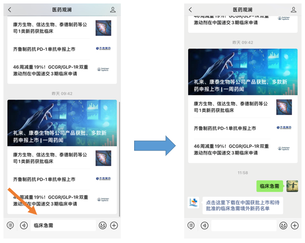 在医药观澜微信号回复“临床急需”(如下图所示),可获得在中国获批上市和待批准的临床急需境外新药名单。