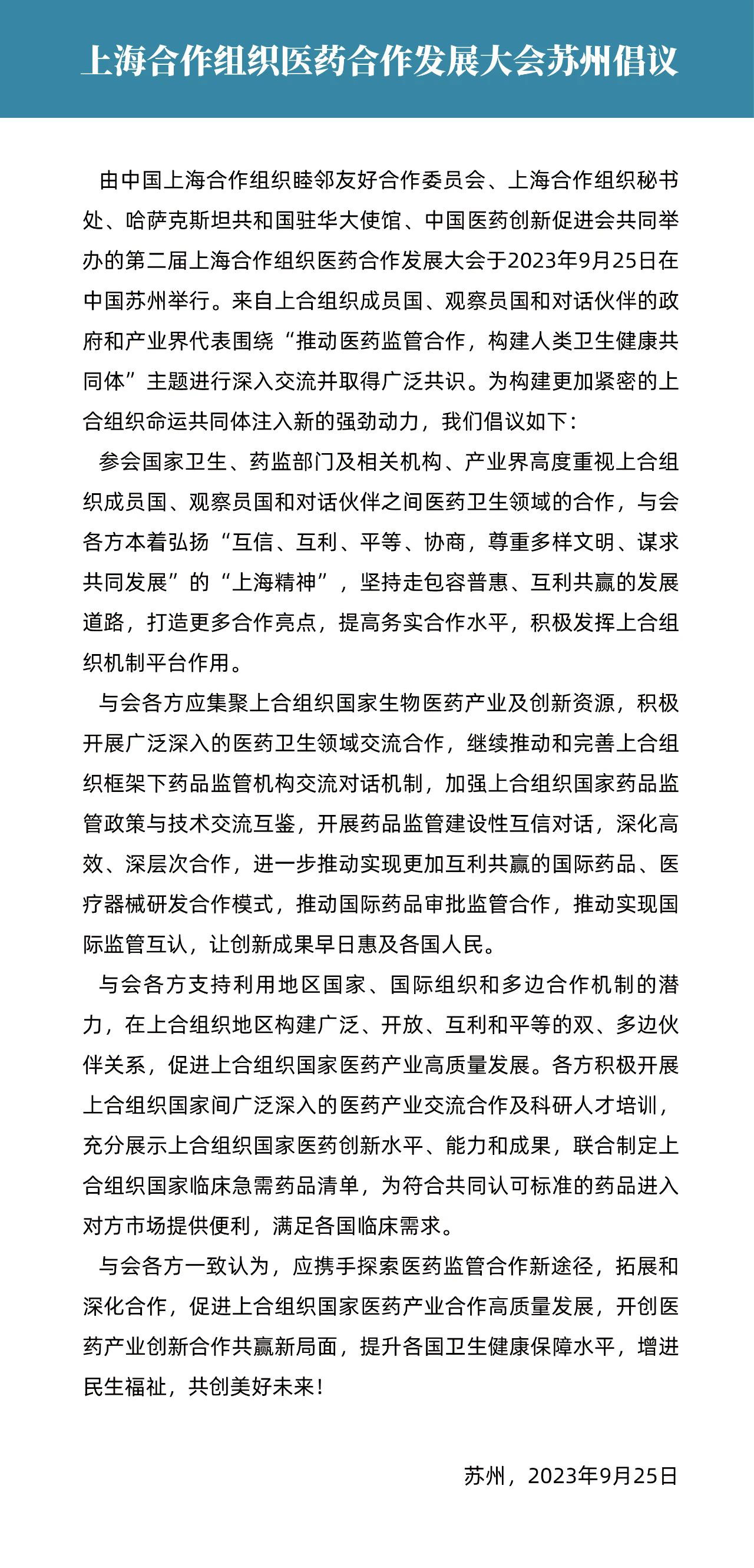 与会各国共同发布了《苏州倡议》,为构建更加紧密的上合组织命运共同体注入新的强劲动力,参会国家卫生、药监部门及相关机构、产业界高度重视上合组织成员国、观察员国和对话伙伴之间医药卫生领域的合作,将积极发挥上合组织机制平台作用,进一步推动实现更加互利共赢的国际药品、医疗器械研发合作模式,推动国际药品审批监管合作,推动实现国际监管互认,让创新成果早日惠及各国人民。