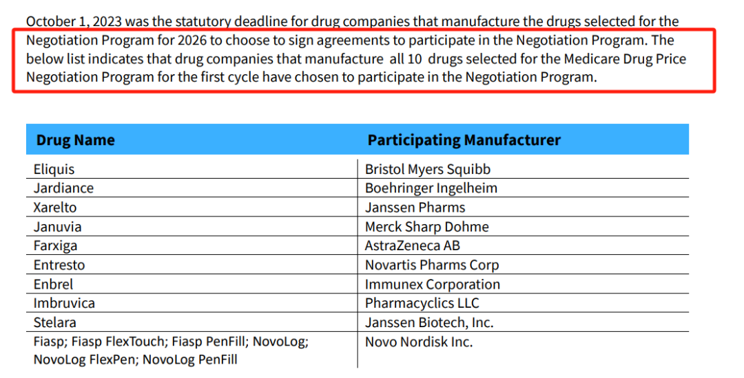 但截止2023年10月3日,也就是“自愿”报名参与谈判日期截至之后的第三天,CMS宣布,所有名单上的药企都同意参与2026年美国医保价格谈判了……