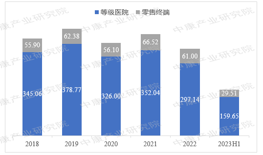 根据中康开思数据,2018~2021年,我国等级医院抗血栓药销售额均超300亿元,2022年由于集采降价等原因销售额略降。2021年等级医院与零售终端销售额达419亿元,2019年峰值达441亿元。
