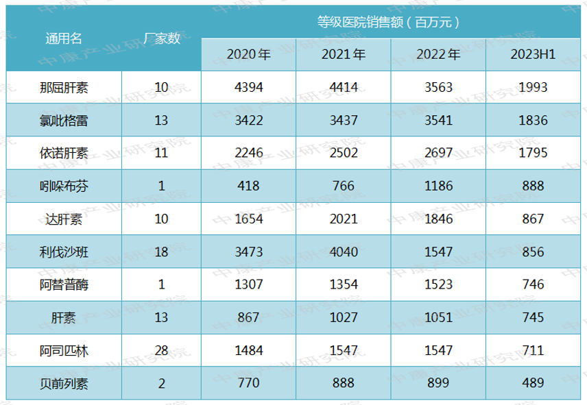 图表2:2023H1抗血栓药国内等级医院销售额TOP10 来源:中康开思数据库,中康产业研究院整理