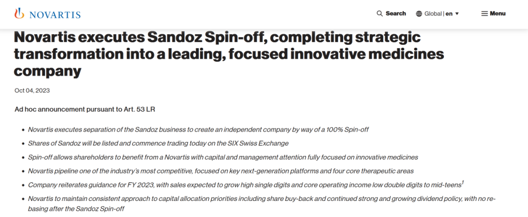 在《2023诺华:除了大刀阔斧整合管线,这些也值得关注!》一文中便提到:“诺华在下半年准备剥离仿制药Sandoz部门,使其在今年Q4完成分拆上市,更专注于心血管、免疫学、神经科学、实体瘤和血液学5大核心创新治疗领域。”可见一切皆在诺华的计划中。