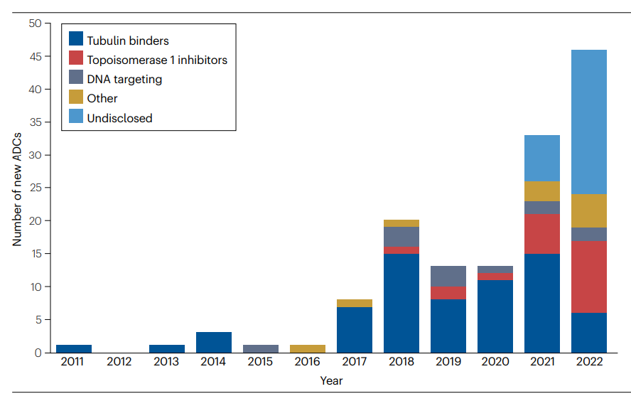 2009年,卡利霉素、金盏花素和美登素类药物是用于ADC开发的主要细胞毒素。十年来,这些分子仍然被用作有效载荷进行优化,以获得更好的稳定性和亲水性。新的细胞毒性物质也被开发出来,如PBDs、杜卡霉素和喜树碱衍生物等。