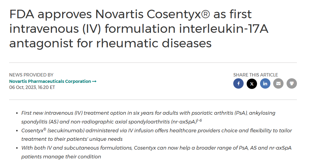 10月6日,诺华的司库奇尤单抗(secukinumab,商品名:Cosentyx)静脉注射剂获FDA批准上市,用于治疗成人银屑病关节炎(PsA)、强直性脊柱炎(AS)和非放射学中轴型脊柱关节炎(nr-axSpA)。该产品是唯一一款获批上市的IL-17A单抗静脉注射剂,也是PsA、AS和nr-axSpA等疾病在肿瘤坏死因子α(TNF-α)抑制剂以外的第二个静脉注射选择。