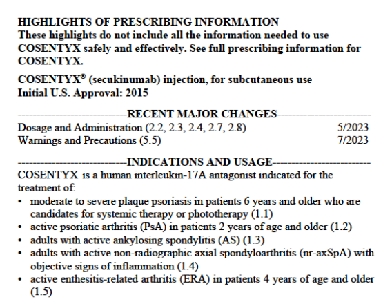 司库奇尤单抗是诺华开发的一款IL-17A单抗,最初的剂型为皮下注射剂。司库奇尤单抗皮下注射剂于2014年12月首次在日本获批上市,随后于2015年1月在欧美获批上市。该皮下注射剂目前已在美国获批5项适应症:1)6岁及以上可以接受系统治疗或光疗的中重度斑块状银屑病;2)2岁及以上活动性PsA;3)成人活动性AS;4)有客观炎症迹象的成人活动性nr-axSpA;5)4岁及以上活动性附着点炎相关关节炎(ERA)。