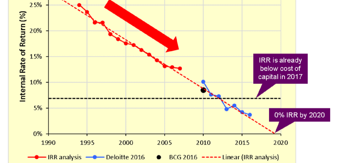 Scott研究了几十家大创新药公司的数据,在2017年,他推算,到2020年,这些巨头R&D投资回报率会降到0。