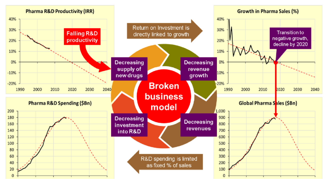 2017年,美国一个著名的药物经济学家Scott发表了一篇文章《全球制药工业的破产模式》,他提出了“Law of Diminishing Return”观点,即,药物创新的投资收益是逐渐降低的,而且不可逆转。