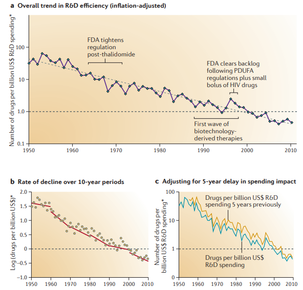显然,是FDA新药监管过程,造成了反摩尔定律。也就是说,1962年的Kefauver-Harris修正案和1984年的Hatch-Waxman法案,既形成了现代制药工业的基础构架,也造就了制药工业的“反摩尔定律”。Kefauver-Harris修正案的随机,双盲,对照,RCT造就了药物开发本身难度,Hatch-Waxman法案的专利悬崖,更进一步迫使制药企业为避开仿制药竞争,只能去开发更难,失败率更高的项目。