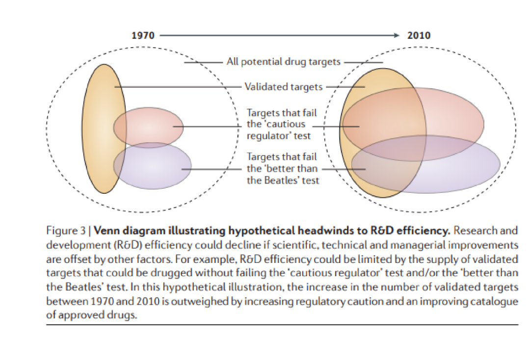 下面这张图,就是Scannell解释,为什么从1970年开始,从靶点出发,寻找药物,其效率越来越低,失败率越来越高。