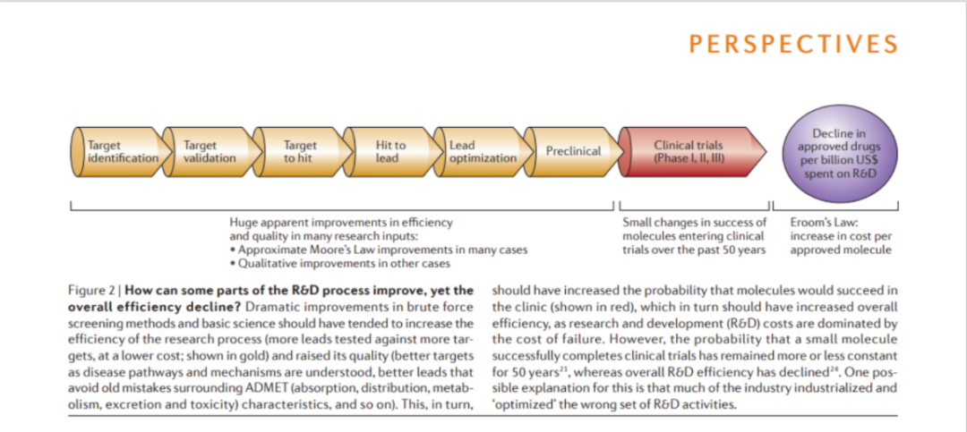 Scannell对药物开发的路径做了排列(如下图所示)。他认为,随着科学技术的进步,药物开发的临床前阶段,是遵循正向摩尔定律的,即,科学技术确实提高了寻找候选药物的效率。但是,进入Phase I,Phase II,Phase III,到 NDA,遵循反摩尔定律。所以,药物开发的全过程,仍然是反摩尔定律。