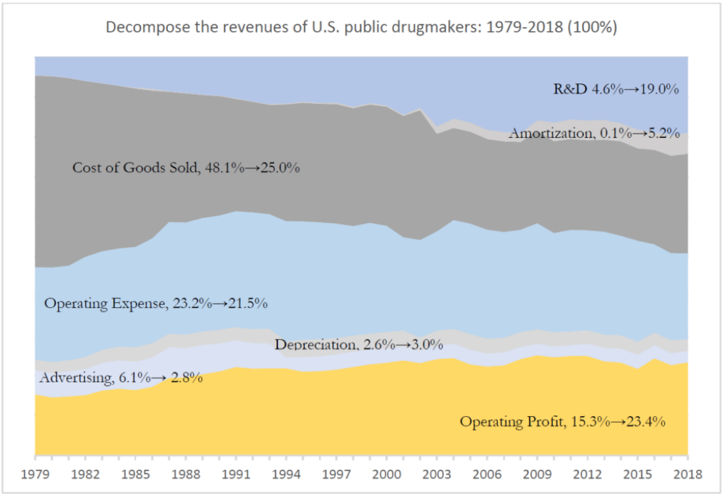 从下方图表可看出,从1979年开始,能明显看到了研发费用的投入比例增加,经营和销售费用相对走低。甚至在很多大公司中,研发费用的开支已经高于它的净收入。如果这种趋势持续下去,新药研发何以为继?