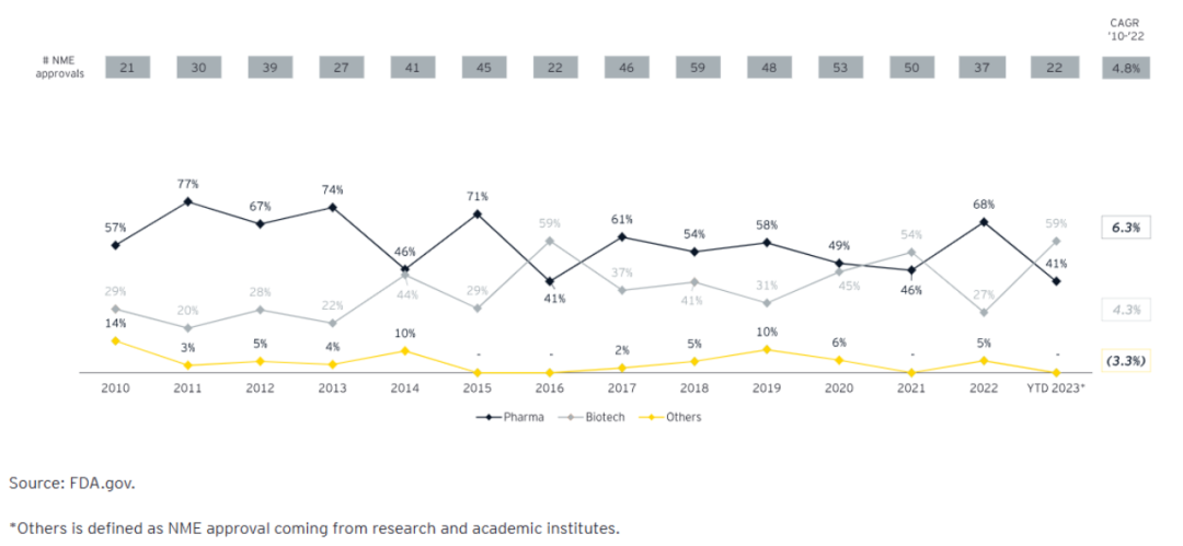 尽管创新效率下降,但是全球来看,每年参与创新的企业、R&D管线项目都呈现成倍增长。其中,大公司上市新药数量越来越少,小公司上市新药数量越来越多。