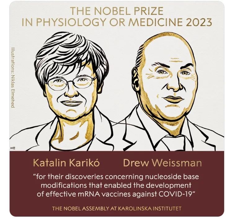 10月2日下午,瑞典卡罗琳医学院宣布,将2023年诺贝尔生理学或医学奖授予卡塔琳·考里科(Katalin Karikó)和德鲁·韦斯曼(Drew Weissman),以表彰他们在信使核糖核酸(mRNA)研究上发现了核苷碱基修饰,这让抗COVID-19 mRNA疫苗的研发达到前所未有的速度。