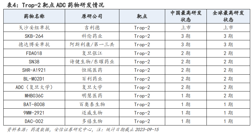 Trodelvy是国内唯一一款上市的Trop2 ADC,2022年销额6.8亿美元,2023年上半年销额4.82亿美元,有望今年突破10亿。SKB-264进展到3期的适应症为乳腺癌,Dato-dxd的乳腺癌和非小细胞肺癌均进展到3期。
