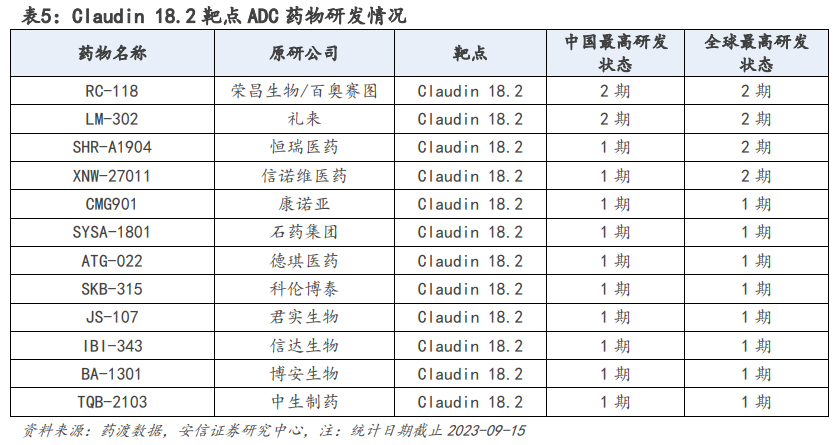 Claudins(CLDNs)为紧密连接(TJs)蛋白家族,能够连接细胞,形成细胞旁屏障。它们主要分布在胃、胰腺和肺组织中,可以用于疾病的诊断和治疗。CLDNs有四个跨膜结构域(TMDs),NH2和COOH端位于细胞内,另有ECL1和ECL2两个胞外环。磷酸化位点在细胞质位点的C端。CLDN 18.2作为其中一种亚型,由261个氨基酸组成。CLDN18.2的重要性突破在于去年安斯泰来的zolbetuximab抗体两项3期临床接连成功,今年6月在日本申报上市。ADC进展相对单抗要慢一些,但国内外进展差距不大,均处于1、2期。