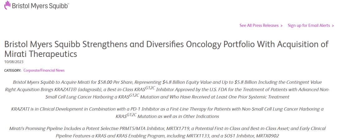 10月8日,百时美施贵宝(BMS)和Mirati Therapeutics宣布,双方已达成最终合并协议,BMS同意以每股58美元的现金收购Mirati,总股本价值为48亿美元。Mirati股东持有的每一股Mirati股票还将获得一份不可交易或有价值权(CVR),价值可能为每股12.00美元现金,代表额外10亿美元的价值机会。该交易得到了百时美施贵宝和Mirati董事会的一致批准。