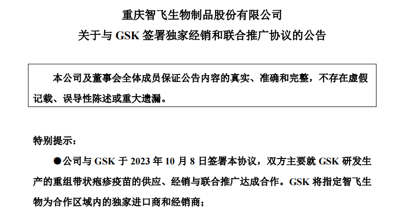 10月9日,智飞生物发布公告,宣布与GSK签署了《独家经销与联合推广协议》,双方就GSK研发生产的欣安立适 (重组带状疱疹疫苗)开展深度合作;此外智飞生物还将获得GSK明星产品RSV疫苗的商业化优先权。
