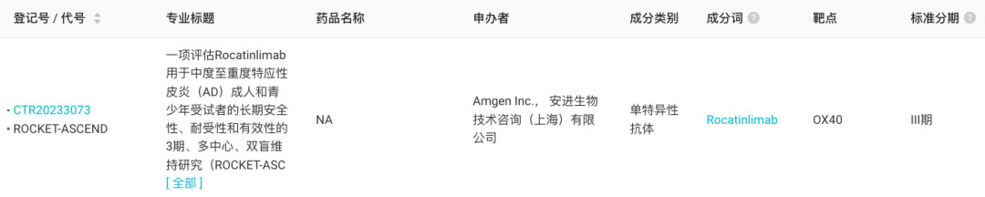 10 月 8 日,据 CDE 官网显示,安进 OX40 单抗 Rocatinlimab(AMG 451)国内启动新 III 期临床 ROCKET-ASCEND 试验(登记号:CTR20233073),这是一项旨在评估 Rocatinlimab 用于中度至重度特应性皮炎(AD)成人和青少年受试者的长期安全性、耐受性和有效性的多中心、双盲维持研究。