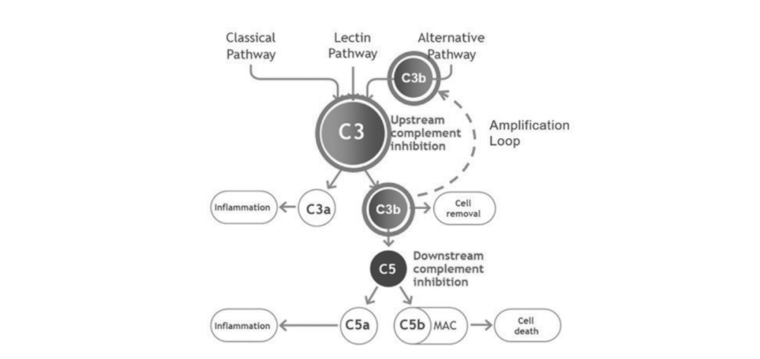 在补体系统中,C3蛋白处于补体级联反应的中枢位置,可对补体系统的3条激活途径(经典途径、凝集素途径和替代途径)以及所有的下游效应进行调控,属于C5蛋白的上游。