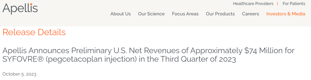 Apellis近日公布了Syfovre第三季度的预期销售额为7400万美元,相较于二季度6730万美元的销售额继续增长。