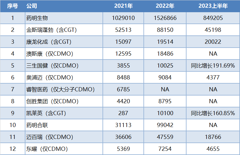 注:以上信息均来自上市公司年报或招股书或公告。单位万元人民币。1)金斯瑞收入2021年,2022年和2023上半年分别为81.4百万美元、1.3亿美元、64.7百万美元汇率分别按6.4512、6.7808和6.9858计算;2)睿智医药的大分子CDMO板块在2022年报中与小分子CDMO合并,2023年半年报中与大分子早期发现合并,故无法区分出来