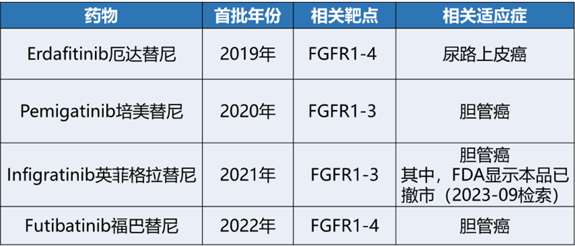 表1. 已获批的选择性FGFR靶向抑制剂,截止2023年9月