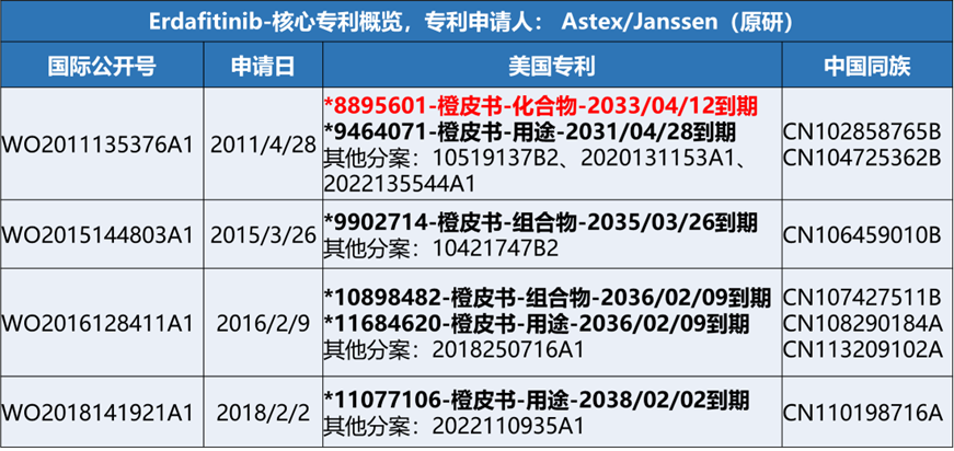 表2. Erdafitinib核心专利详情;A代表发明公开,B代表发明授权