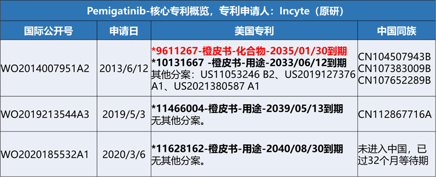 表3. Pemigatinib核心专利详情;A代表发明公开,B代表发明授权