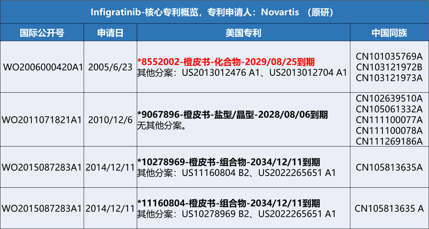表4. Infigratinib核心专利详情;A代表发明公开,B代表发明授权