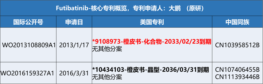 表5. Futibatinib核心专利详情;A代表发明公开,B代表发明授权