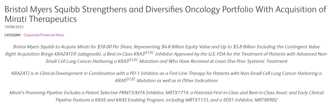 10 月 8 日,百时美施贵宝(BMS)宣布以 48 亿美元收购 Mirati Therapeutics。此前在十一期间,外媒曾有报道称赛诺菲正在考虑收购 Mirati,还带动 Mirati 股价大涨 45%,结果却是 BMS 将其收入囊中。