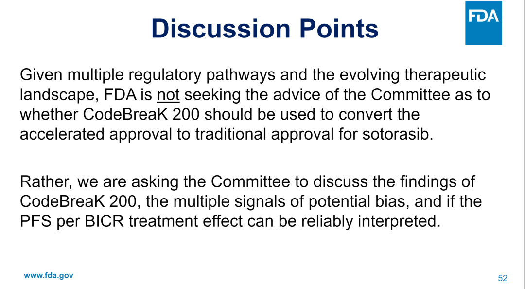 尽管 FDA 强调,这次会议并非为了评估 Sotorasib 能否由加速批准转为完全批准,而是为了讨论其 PFS 结果能否信服,但负面意见仍为后续「转正」蒙上一重疑云。而对于后续参与者,也许无形间提供了证明 BIC 潜力、获取医生认可的机会,尤其是上市仅略迟一步的第 2 款 KRAS G12C 抑制剂 Adagrasib。