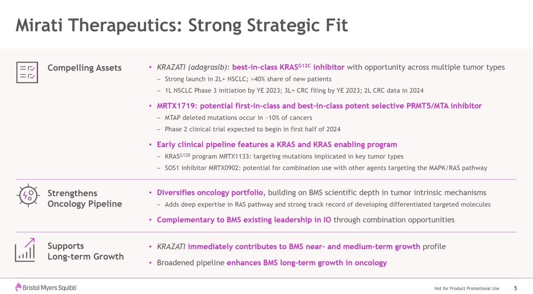 BMS 在收购中也表示,Mirati 的资产与百时美施贵宝的产品组合和创新产品线非常契合。通过此次收购,BMS 得以把 Adagrasib 加入其商业产品组合中,并获得了多款有前景的临床阶段资产,补充其肿瘤学管线,并为单药开发和联合疗法提供更多选择。