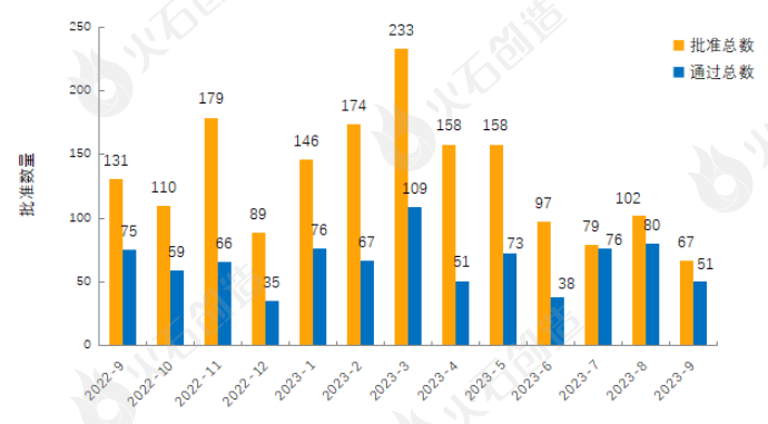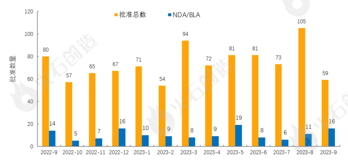 图1 2022年9月—2023年9月FDA药物批准数量变化情况 来源:火石创造产业数据中心