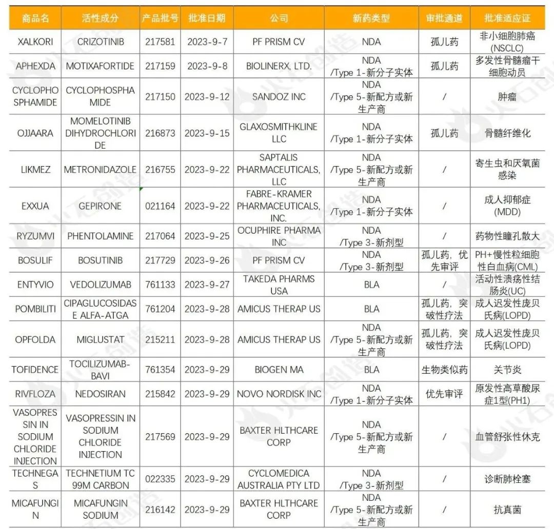 表1 9月FDA批准NDA/BLA药物列表