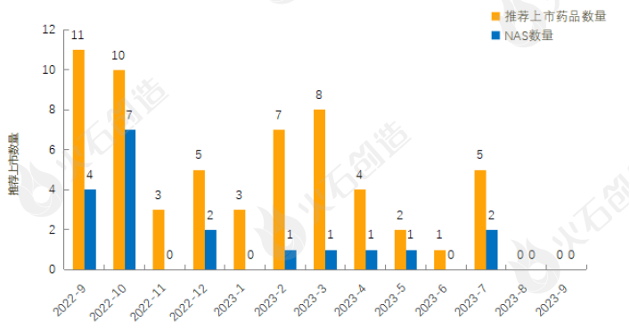 截至2023年10月10日EMA官网披露,2022年9月至2023年9月的推荐上市药品及新活性物质(NAS)数量情况见图2,2023年9月EMA未推荐药品上市。