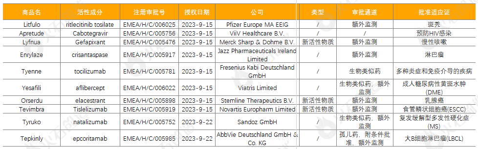 截至2023年10月10日,EMA在9月新授权10款药品上市,其中包含3款新活性物质,见表2。