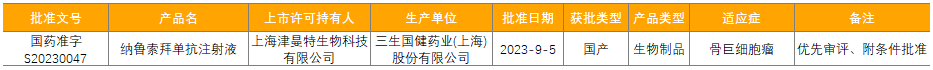 纳鲁索拜单抗注射液是石药集团附属公司津曼特生物开发的一款IgG4亚型全人源抗RANKL单克隆抗体,此次获批上市用于治疗不可手术切除或手术切除可能导致严重功能障碍的骨巨细胞瘤成人患者,其上市为患者提供了新的治疗选择。