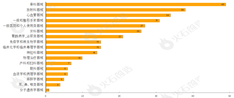 通过对510(k)上市前通知的器械根据美国医学专业用途进行分类,结果发现,9月产品获批类型最多的为骨科器械、放射科器械、心血管器械、一般和整形手术器械与一般医院和个人使用类器械,见图4。