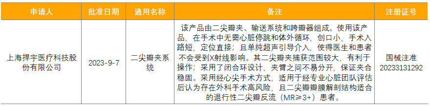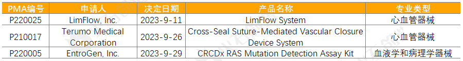 2023年9月有3个通过上市前批准(PMA)途径首次上市的产品。