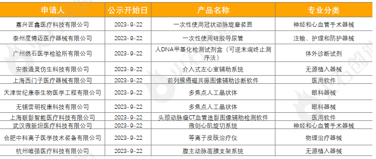 截至2023年10月10日,2023年9月国家局公示了11个三类医疗器械进入创新审批绿色通道,见表5。