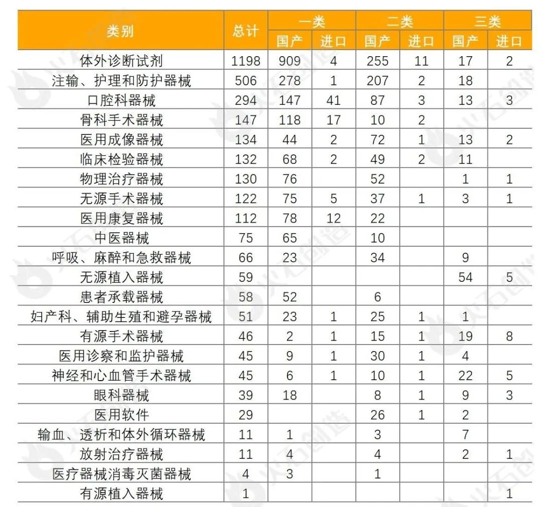 统计数据显示,体外诊断试剂数量最多,共1198项,占36.14%,基本上均为国产,为1181项。除体外诊断试剂,批准注册类别数量排前三位的分别为注输、护理和防护器械,口腔科器械和骨科手术器械。