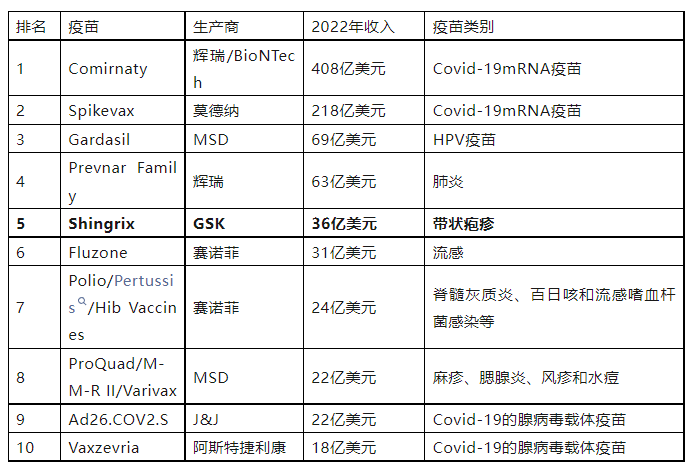 据GSK财报显示,2018年,Shingrix全球销售收入超10亿美元,上市后的第一个完整年就已轻松晋升为“10亿美元大单品”,2019年销售22.1亿美元,2020年,Shingrix销售额超27亿美元。根据最新披露的年报数据,2022年Shingrix全年收入达到36亿美元,同比增长72%,在当年全球疫苗排行榜中位居第5,也是GSK年销售额最高的单品。2023上半年Shingrix继续保持高增长,半年已创下21.9亿美元的全球销售额,同比增长20%。