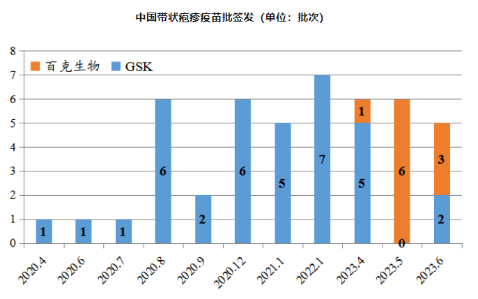根据中检院数据,2023H1国内带状疱疹疫苗批签发17批次,2023Q2 带状疱疹疫苗批签发17批次,其中GSK 7批次,百克生物10批次。从签发数量上看,百克生物已切实打破GSK的垄断,并且反超。