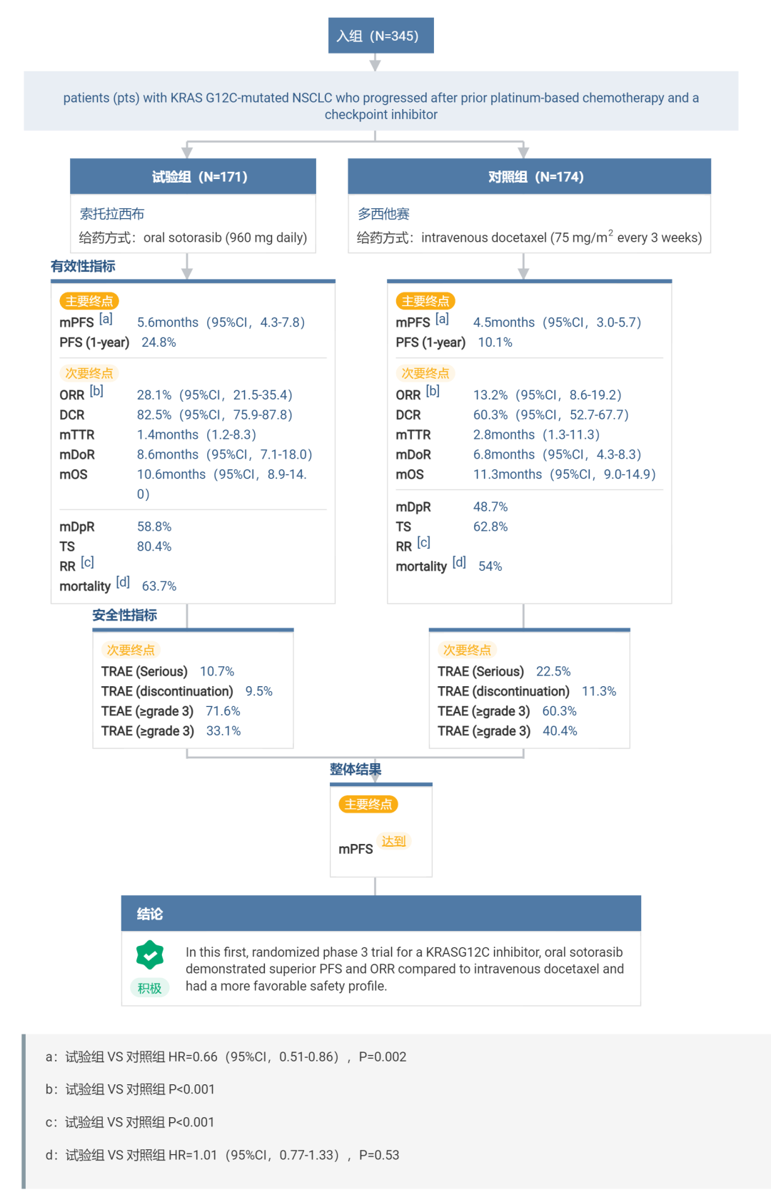 在安进的 III 期 CodeBreaK200 研究中,Sotorasib 相较于多西他赛降低了 34% 的疾病进展或死亡风险,实现了 1.1 个月的 PFS 延长(5.6 个月 vs 4.5 个月,HR=0.66,95%CI: 0.51, 0.86,P=0.0017)和更高的 ORR(28% vs 13%)。